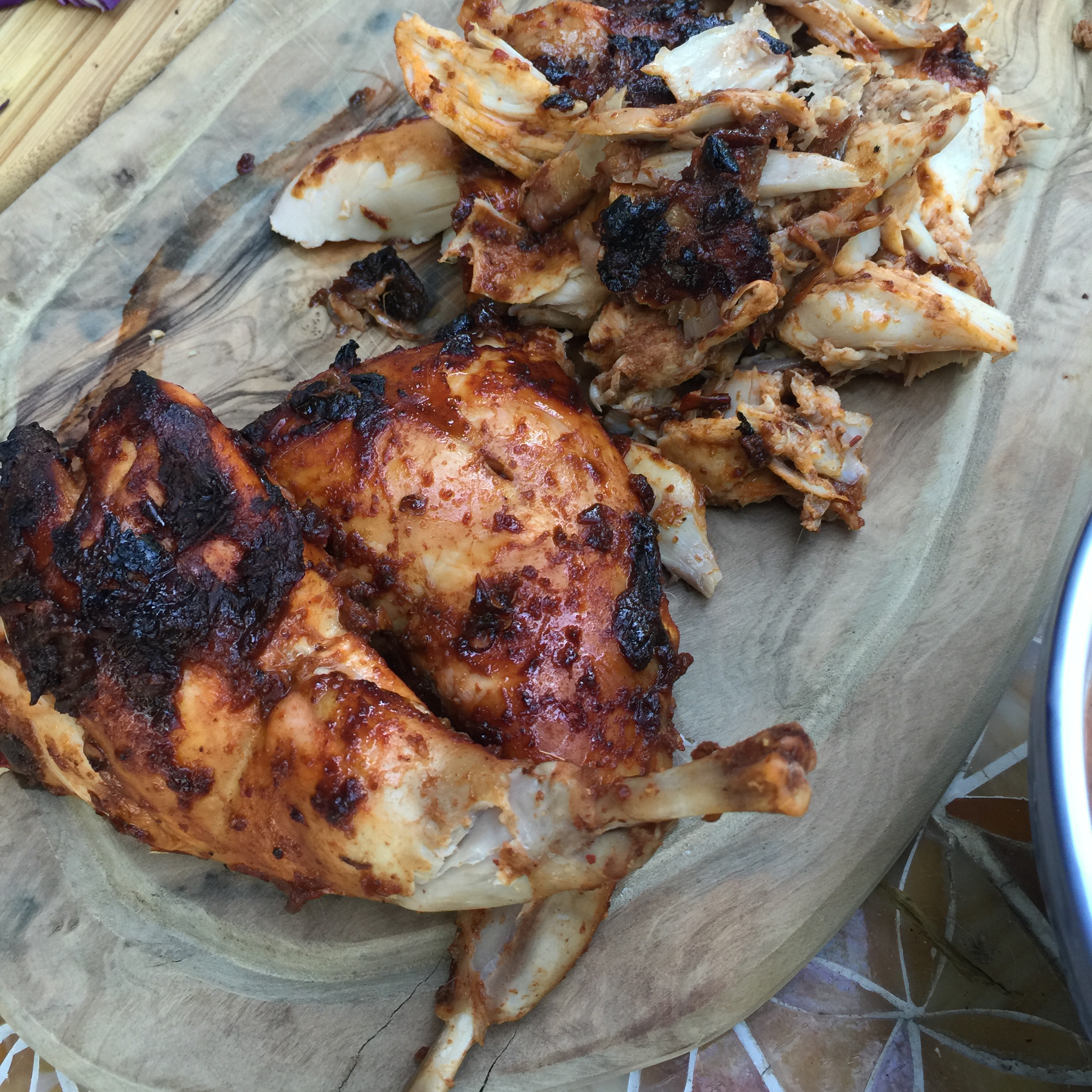 You are looking for a internal temperature of 160 degrees. I let this one roast for about 25 minutes and then started basting with my leftover paste for the rest of the cooking time (about 40 minutes). I let this guy go low and slow to ensure a nice succulent rabbit. Take off the spit and let rest for 10 minutes.